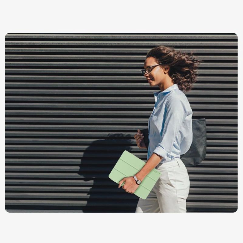The accordion-shaped front panel protects the display, and the device's sleep/wake technology extends battery life. The case can also be used as a stand for more comfortable use.