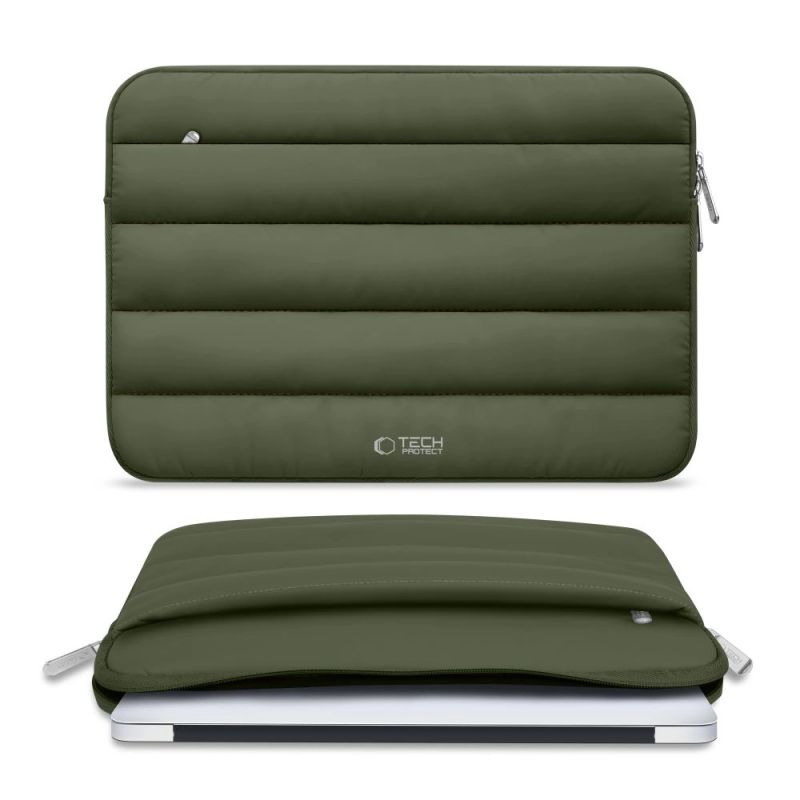 The case features two practical pockets – a main compartment for a laptop and an additional, smaller pocket on the front, perfect for accessories, documents, or small items. An elegant metal clasp and a discreet Tech-Protect logo complete the design, emphasizing the modern and minimalist design.
