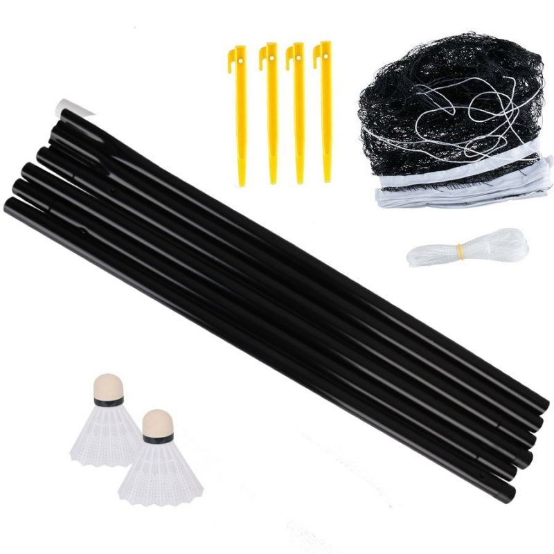 - The set includes: 4 aluminum rackets, 2 nylon shuttlecocks, foldable posts, guy ropes, pins and a net.