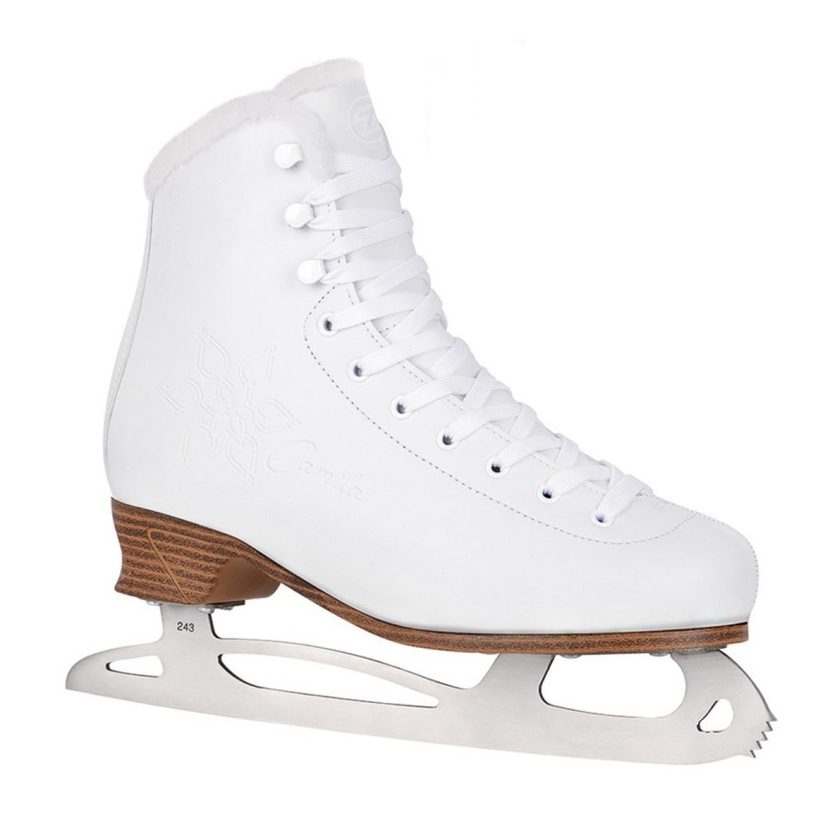 TEMPISH Camila Ice Figure Skates The CAMILA ICE women's ice skates are designed for discerning women. They are made of high-quality PU-based synthetic material. The skates feature a solid frame with an anatomically shaped ankle. The inner lining conforms to the shape of the foot and ensures comfort. The lining uses a new generation of SUPER SOFT FUN FUR material, which is pleasant to the touch and has excellent insulating properties, ensuring a pleasant feeling of comfort and warmth while skating. The skates are equipped with a new, original TEMPISH sole, which has a lower heel and a new, fresh look. The new TEMPISH WAVE blade is used – more elegant and lighter, yet harder. A high-quality, solid connection between the upper and the sole is made. TECHNICAL PARAMETERS Intended use Riding, recreational, fashion Blades TEMPISH WAVE, stainless steel, polished Outer material PU material in 3 layers, one layer has a relief print Inner material SuperSoft fur with thermal insulation properties Anatomical tongue Fastening system Laces Lining INTEGRAL thermo-anatomical lining with memory based on DB 320 latex.