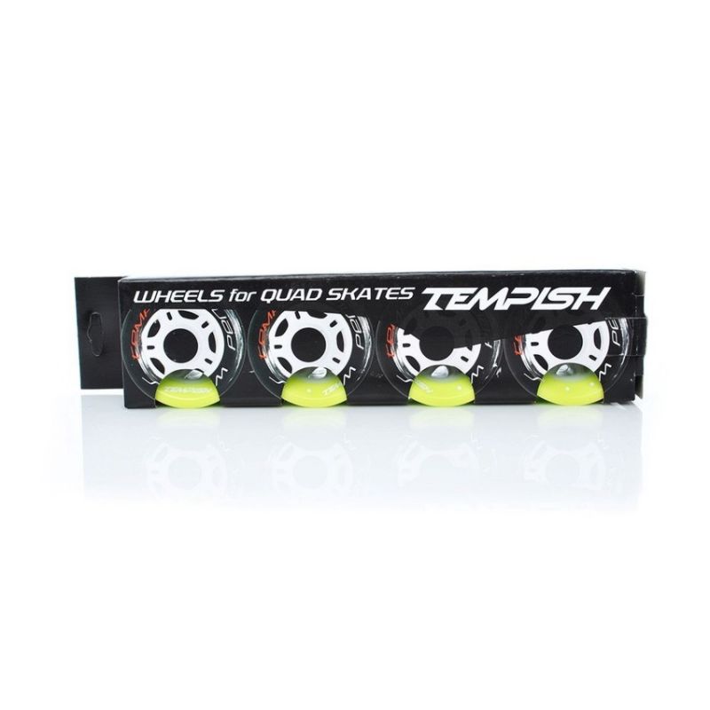 A set of four Quad roller skate wheels with extended durability and low rolling resistance. This series is suitable for skating on smooth surfaces. Color: green. Application: recreational sports. Diameter: 57 mm. Hardness: 93 A. Number of wheels in the set: 4.