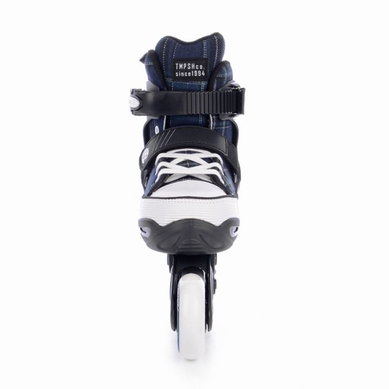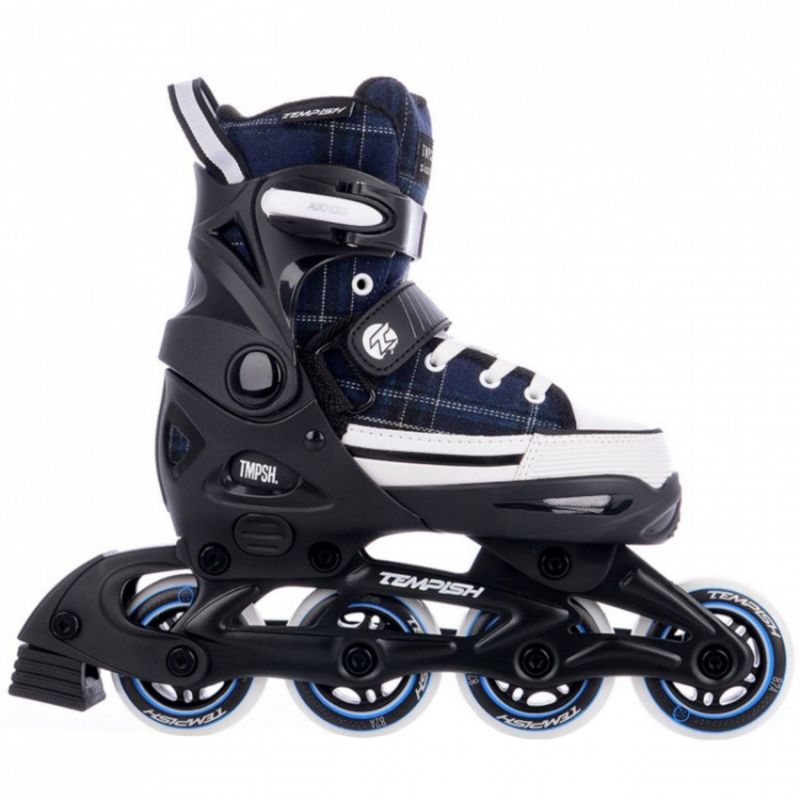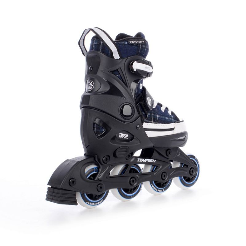 Tempish Rebel T Adjustable Inline Skates High-quality adjustable children's inline skates designed for recreational skating for beginners and advanced skaters. This model features a simple and convenient enlargement system using a button on the side of the frame, thanks to which the skates can be adjusted in 4 sizes. TECHNICAL PARAMETERS Intended Use Recreational and fitness (conditioning) skating, medium to heavy loads, for beginners and advanced users Chassis Stress-relieved AL alloy, 2-piece, 3D-embossed construction. Wheel Size Size 29-32: 64mm wheels Size 33-36: 70mm wheels Size 37-40: 72mm wheels Size 40-43: 76mm wheels Wheel hardness 82A Bearings 608, ABEC 7 Lacing system Laces Type | Shoe shell: Abrasion-resistant, PP/NYLON, 2-piece, soft Liner (inner sock): Stiffened NYLON/CANVAS, anatomical, reinforced with PVC elements. Adjustable size. Brake included. Top closure. Buckle. 45-degree closure. Velcro. Axles - Weight limit: 60 kg