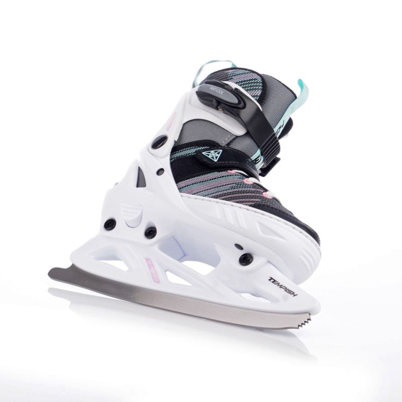 TEMPISH Systent Girl Adjustable Ice Skates. Comfort, safety, and fit for the youngest. TEMPISH Systent Girl ice skates are an excellent choice for girls just starting their ice skating adventure, as well as for those looking to develop their skills. With size adjustment, a sturdy construction, and a comfortable liner, they ensure comfort and safety during every ride. Key features: Size adjustment and ease of use: 4-size adjustment system with a button on the side of the frame. Tongue loop for easy on and off. Comfort and fit: Soft, quick-drying lining for warmth and comfort. Anatomically shaped inner boot for secure foot support. Safety and durability: Durable plastic frame stabilizes the ankle. Reflective elements on the back increase visibility in low light. Temperature resistance down to -20°C. TEMPISH Systent Girl are adjustable ice skates designed for growing children's feet. They combine functionality, safety, and comfort, allowing young skaters to enjoy ice skating for many seasons. TECHNICAL SPECIFICATIONS Intended use: Recreational sport Blade: TEMPISH UNI CARBON steel – stainless steel Outer material: Three-piece frame – TPU (flexible to -20°C), soft lining, PVC BRILLIANT RESIST, NYLON+NYLEX Inner material: CAMBRA 26Z brushed nylon with internal lining Fastening system: Laces, 1x buckle, 1x Velcro strap Size adjustment: Yes Weight limit: 60 kg