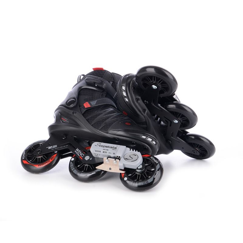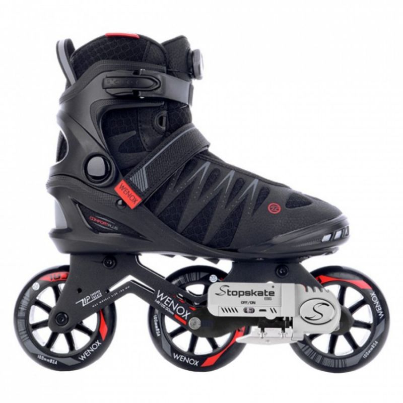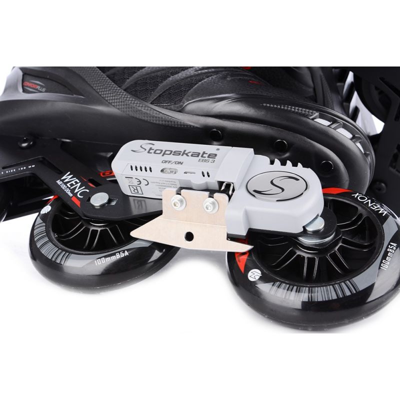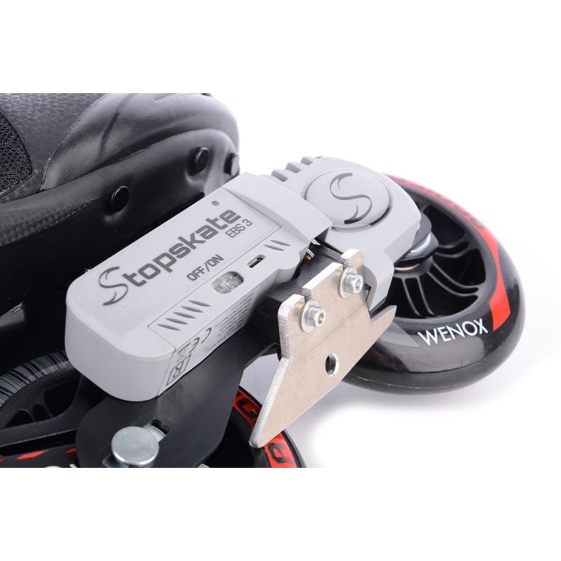 The TEMPISH Wenox Top EBS inline skates feature a revolutionary electromechanical braking system controlled by a wireless controller. Braking on these skates is now more comfortable, safer, simpler, and more efficient than a traditional rear-wheel brake! This model is designed for users up to 90 kg. More information about this patented Czech product can be found at: www.stopskate.com. This product is out of stock, with availability within 10 days of receiving your order. These attractive inline skates are designed for active fitness skaters. They combine all the latest technologies and trends in fitness skating. These skates are designed for advanced and experienced skaters. The sturdy three-wheeled frames with wheels up to 100 mm allow for truly fast and comfortable skating, even over long distances. The frames are relatively short, ensuring good mobility and easier maneuverability in areas where you frequently need to change direction. The comfortable insole has two layers. The harder outer layer holds the foot firmly in the shell, while the softer inner layer tightly encloses the foot, providing a feeling of high comfort and safe skate control. For added safety, the skates are equipped with reflective elements that significantly increase their visibility in poor visibility. The solid shell is ventilated through the sole, and air is distributed through the insole under the entire foot. The modern TEMPISH lacing system allows for quick on and off. By tightening the strap on the instep and the upper buckle on the collar, each user can adjust the optimal foot position in the shell for perfect and comfortable skate control. TECHNICAL SPECIFICATIONS: Intended Use: Fitness, beginners, advanced, and experienced skaters. Frame: Made of aluminum alloy, fixed frame attachment system. Wheel size: 100mm Wheel hardness: 85A Bearings: 608, ABEC 9 Lacing system: FitGo Type | PE/NYLON shoe shell, two-piece anatomical ankle space, reinforced raised construction. Liner (inner sock): Reinforced NYLON/NYLEX, anatomical, memory material, reinforced on the outside, soft padding around the Achilles tendon, anatomical insole. EBS brake. Top closure: Buckle. 45-degree Velcro closure. 6/28mm axles. Weight limit: 90kg.