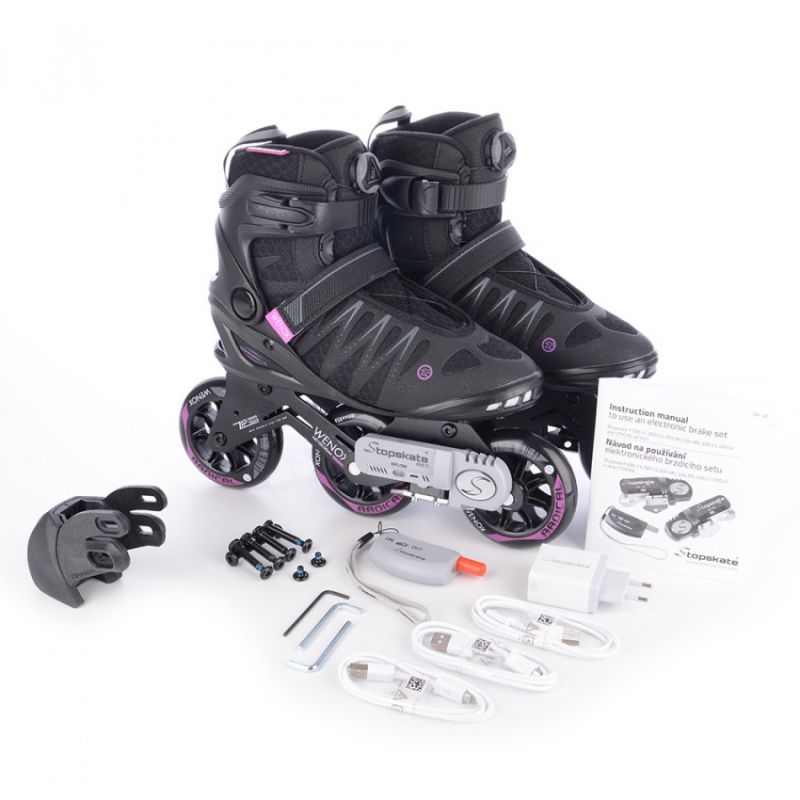 - The roller skates are equipped with a revolutionary electromechanical braking system controlled by a wireless controller.