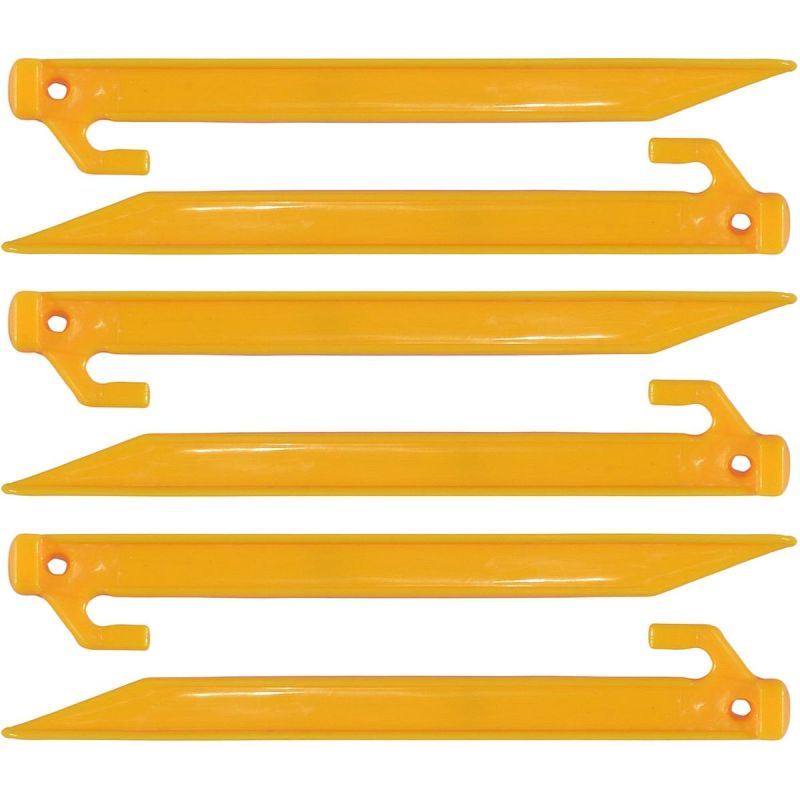 You know that feeling when you're at the beach and your towel blows away with every gust of wind, or when you want to go camping and you're running out of tent pegs? These 22 CM PLASTIC TENT PEGS (SET OF 6) will help you secure your tent, beach blanket, or beach umbrella to the ground. This set consists of 6 large plastic pegs with a long, strong V-shaped spike. They effectively anchor your tent to the ground, and their bright color makes them easy to spot in the grass. These pegs are a complete set, allowing you to optimally position and tension your lines.