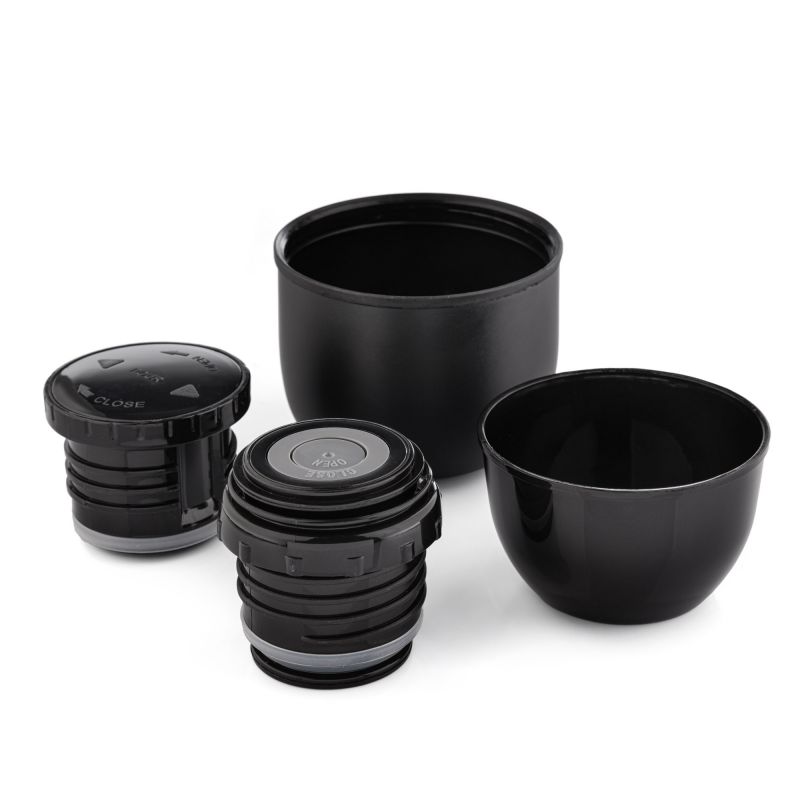 - The lightweight and compact design features a wide opening for easy filling and cleaning. The functional lid doubles as a drinking cup with an insulating insert. A second cup sits underneath, allowing you to share your drink with others. The push-button adjustable cap allows for easy one-handed pouring and is equipped with a seal to prevent leaks and heat loss.