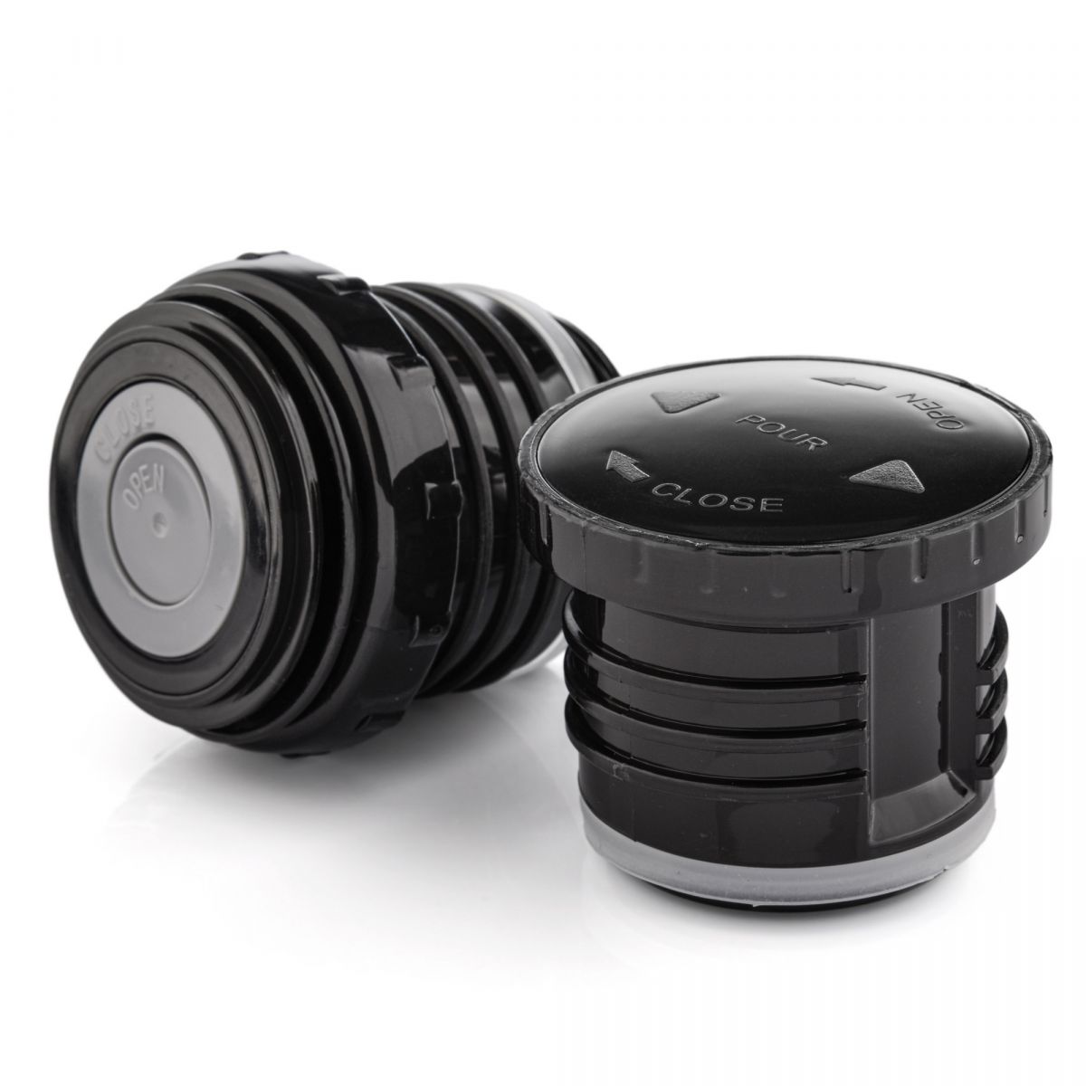 - The lightweight and compact design features a wide opening for easy filling and cleaning. The functional lid doubles as a drinking cup with an insulating insert. A second cup sits underneath, allowing you to share your drink with others. The push-button adjustable cap allows for easy one-handed pouring and is equipped with a seal to prevent leaks and heat loss.