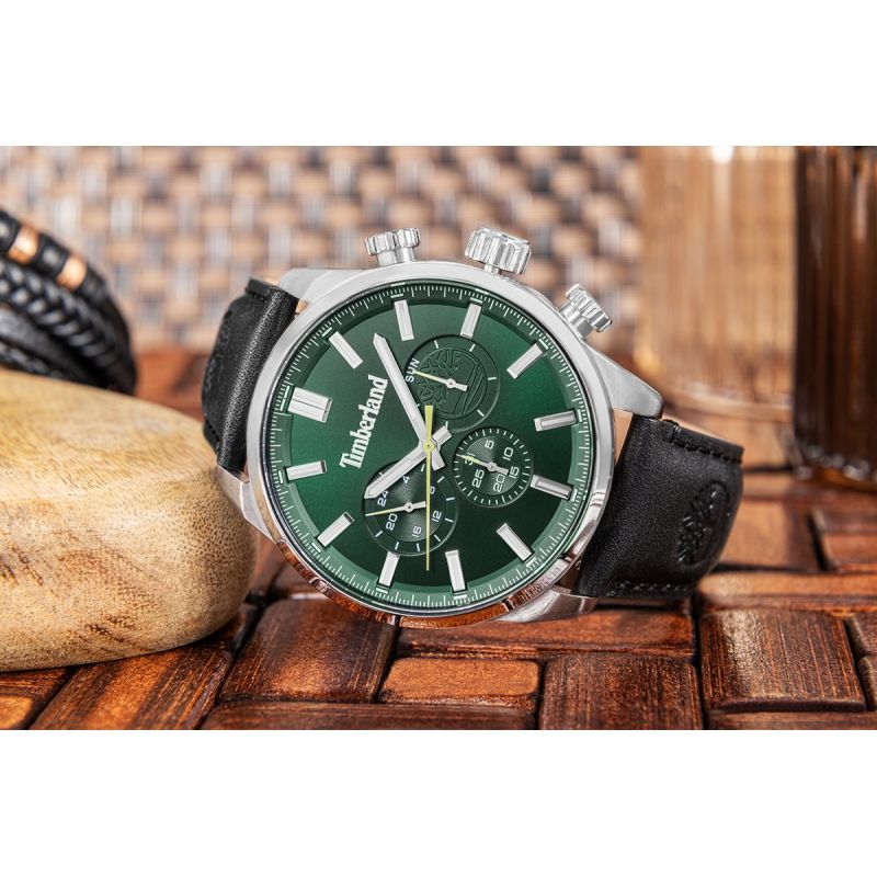 The Timberland Henniker II watch combines functionality with a distinctive, outdoor design inspired by nature. Its most striking feature is the deep green dial, which catches the eye and lends the watch a rugged yet modern character.