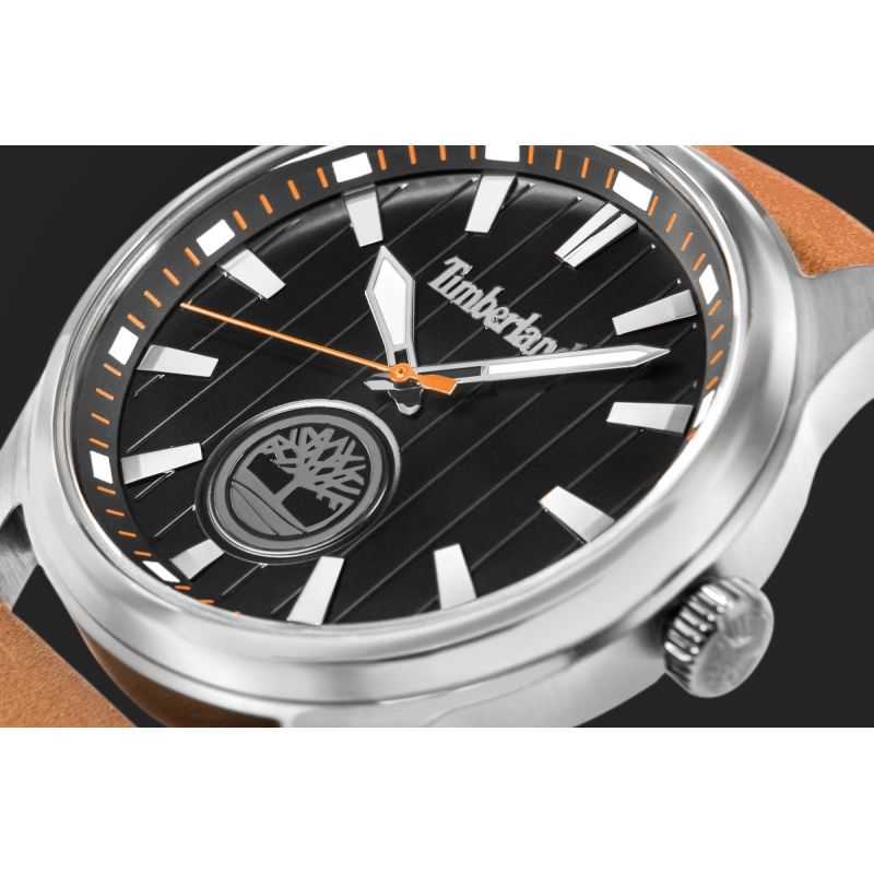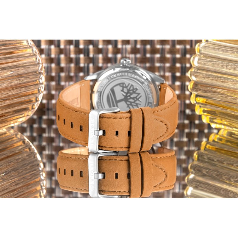 The distinctive Timberland logo embossing completes the look, emphasizing the brand's identity and adding a distinctive character to the strap. This detail not only looks impressive but also contributes to the watch's cohesive, nature-inspired design.
