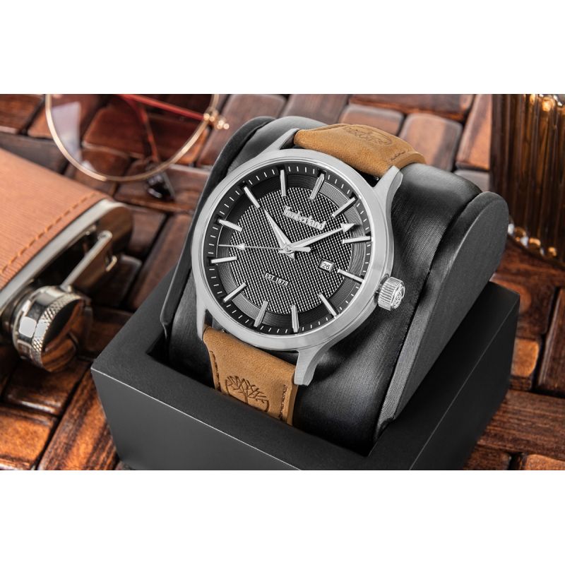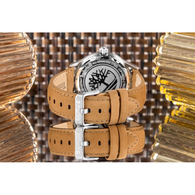 The distinctive Timberland logo embossing completes the look, emphasizing the brand's identity and adding a distinctive character to the strap. This detail not only looks impressive but also contributes to the watch's cohesive, nature-inspired design.