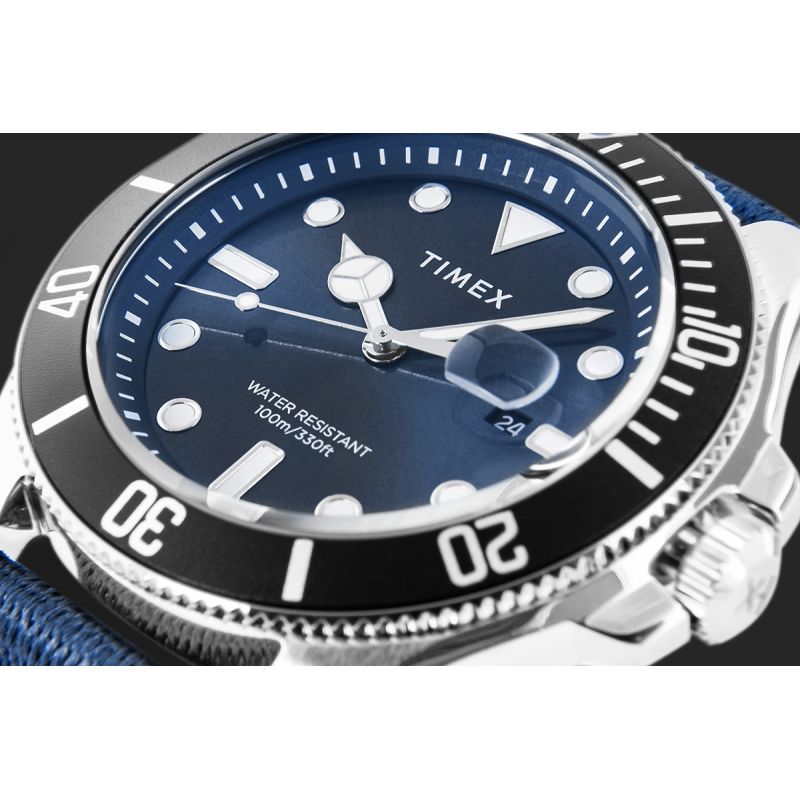This model impresses with its convex case shape, which lends it a solid and masculine character. The delicate curves and precise finish of the case not only enhance its elegant appearance but also ensure comfortable everyday wear. Furthermore, the rotating bezel with clear minute markers, inspired by professional diving watches, adds a sporty touch and practicality. The design is completed by a crown embellished with the Timex "TX" logo and a solid cover.