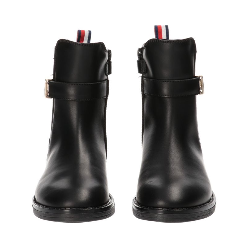 Tommy Hilfiger ankle boots, model T4A5-32022-0283999, in black. The upper is made of a combination of smooth genuine leather and textile. The heel is reinforced, and a decorative buckle around the ankle, embellished with the brand's flag-shaped logo, is featured. A side zipper makes them easy to put on and take off. These comfortable ankle boots are perfect for fall and early winter.