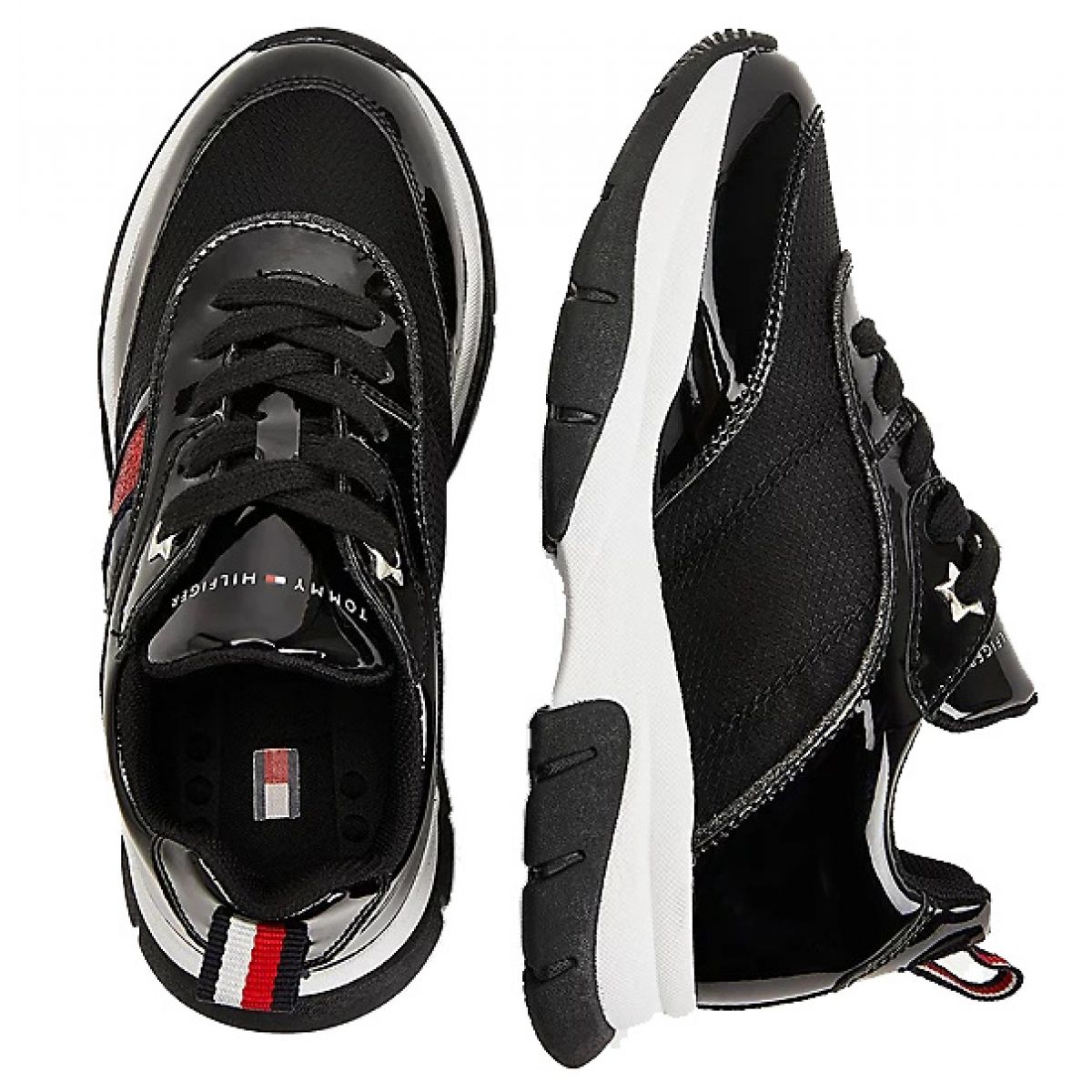 - These lace-up sports shoes with a thick, durable sole look stunning thanks to the patent and glitter inserts on the upper.