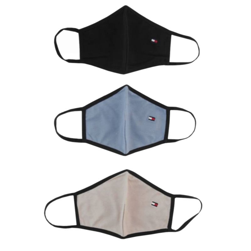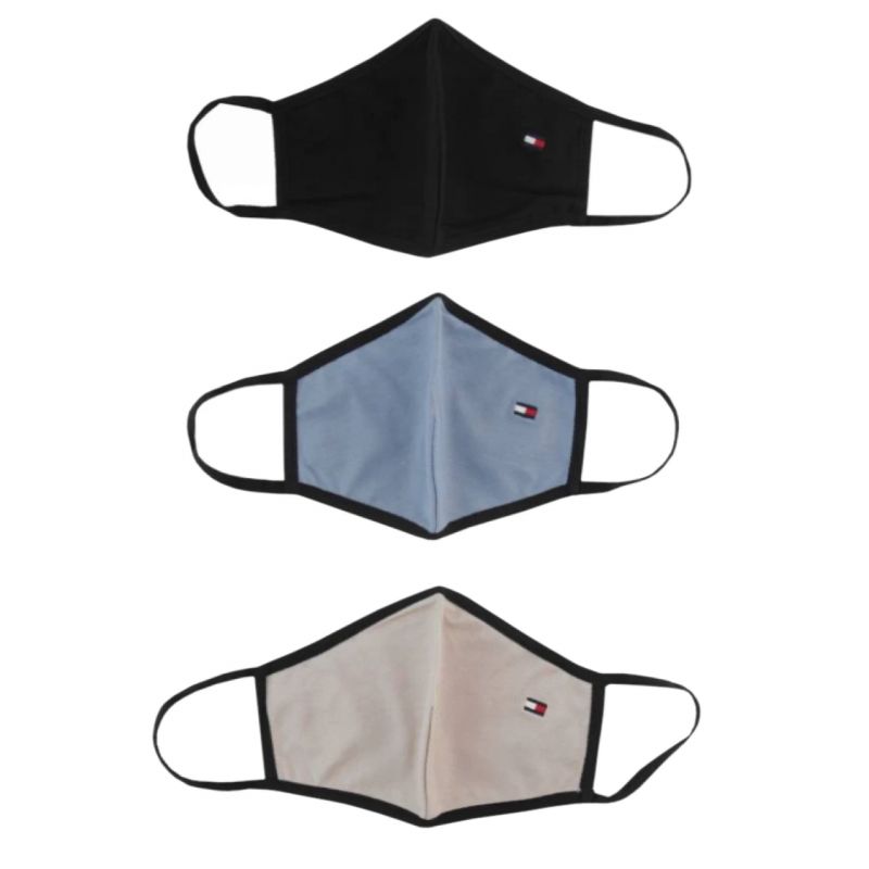 Set of three Tommy Hilfiger fabric masks. Hand or machine washable at 60°C. Attached with elastic bands.