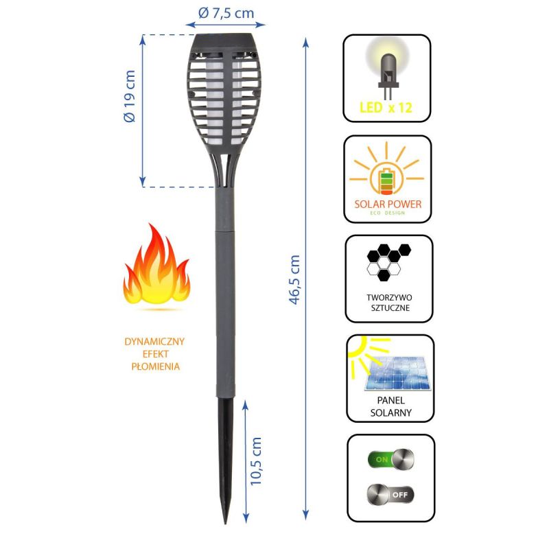 The DANCING FLAMES 12 LED SMD GRAY SOLAR TORCH LAMP is a practical and affordable light source, perfect for outdoor use. You can use it as solar lighting for your facade, lawn, terrace, balcony, driveway, pool, or to illuminate your gazebo or walkway. Simply insert the lamp into the ground using the spike in a well-lit spot. At the heart of the lamp is a solar panel, which collects energy from the sun during the day and stores it in a battery. This stored energy is released only when dusk falls. A built-in twilight sensor is responsible for this. This is a virtually free, eco-friendly form of lighting; you only pay for the lamp. The DANCING FLAMES 12 LED SMD GRAY SOLAR TORCH LAMP is also perfect for areas where you don't have the option of installing an electrical system but would like to illuminate them. Its SOLID CONSTRUCTION and WATER RESISTANCE will make it illuminate whatever you want for a long time, and the effect of dancing flames will create a unique atmosphere.