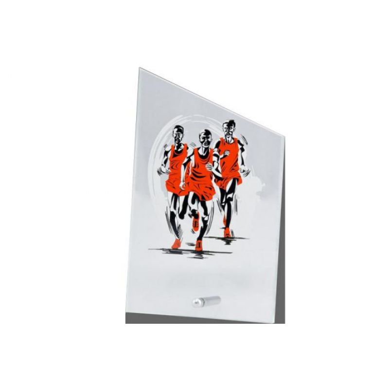 The trophy is made of glass with a metal support featuring a marathon motif. Engraving on the plaque is available as an additional service (price depends on the print area).