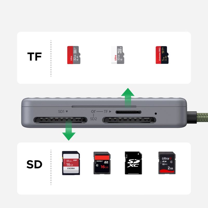 - Supports 3 cards simultaneously: two SD slots and one TF slot increase work convenience.
