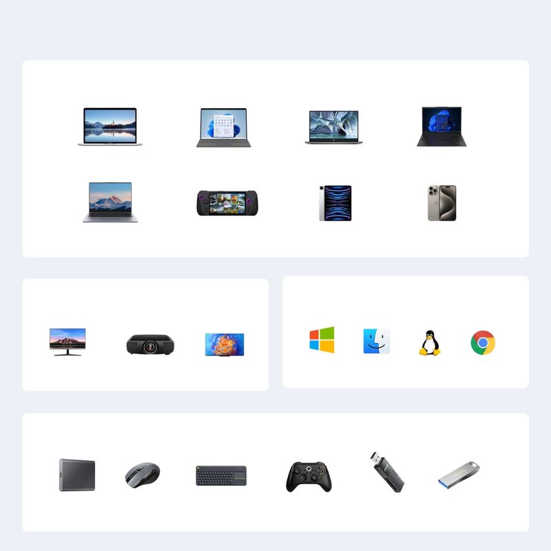 USB-C PD up to 100W lets you charge your laptop while working with the hub, while support for Windows, macOS, Linux, Android, and iOS provides flexibility in different environments.