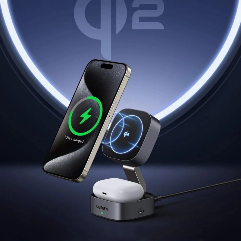 Ugreen W702 3in1 inductive charger with MagSafe / Qi2 and USB-C port for phone / headphones - black
