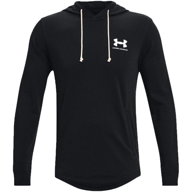 Under Armour UA Rival Terry LC HD Men's Sweatshirt, Black 1370401 001. This Under Armour men's sweatshirt is perfect for everyday wear. The interior is made of French terry. It has a relaxed fit with a curved hem and a slightly longer back. The Under Armour logo is featured on the front. The hood is adjustable with a drawstring. Ribbed cuffs. Material: 80% cotton, 20% polyester.