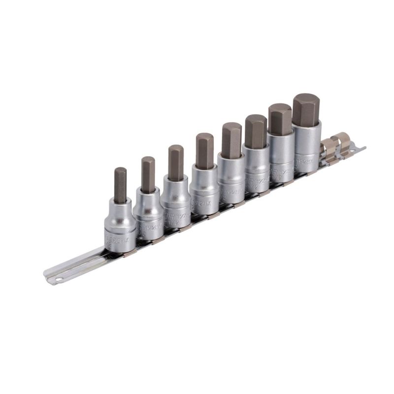 A set of 1/2" HX screwdriver sockets, commonly used in bicycle repair, is packaged on a handy rail. The screwdriver sockets are made of high-quality chrome vanadium steel, and the bits are made of high-quality carbon steel. All screwdriver sockets are fully hardened. The rail allows for convenient storage of the set in a drawer, on a worktop, or mounted on a wall/back panel.