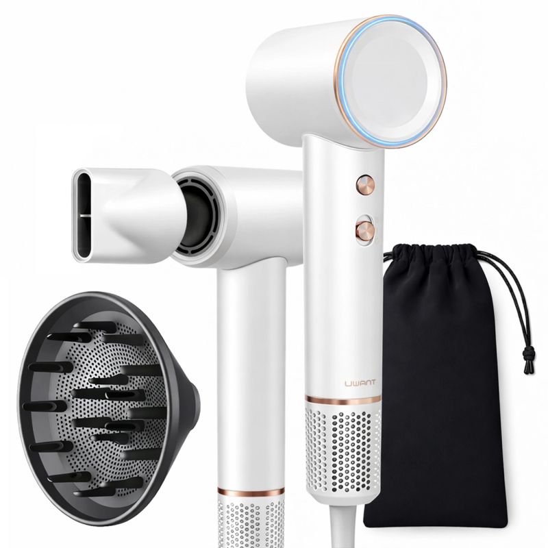 Discover the modern UWANT H100 hair dryer, which combines advanced technology with excellent protection and efficiency. Thanks to its innovative temperature control system, powerful brushless motor, and alternating hot and cold air function, your hair is always safe and perfectly styled. Additionally, the ionization function eliminates frizz, and the device's quiet operation allows for comfortable use at any time of day. The UWANT H100 hairdryer is the choice for those who value quality, speed, and top-notch styling. The set also includes a practical diffuser that facilitates curling and adds volume.