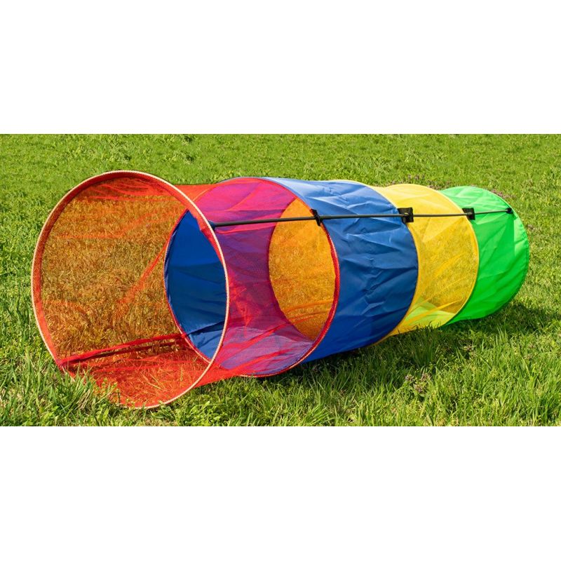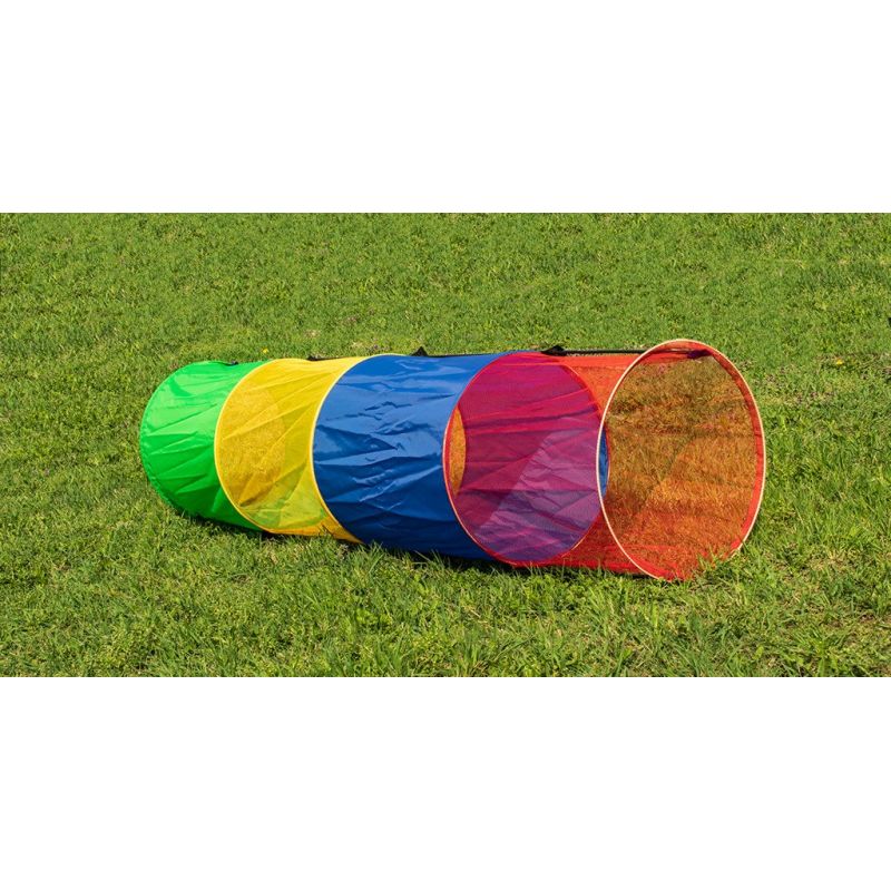 The tunnel consists of four colorful, circular panels. The panels are made of colorful mesh and plain fabric. The tunnel measures 240 cm by 60 cm. The tunnel is easy to set up and transport. The frame (hoops) are made of flexible plastic, as are the crossbars that secure the tunnel from collapsing.