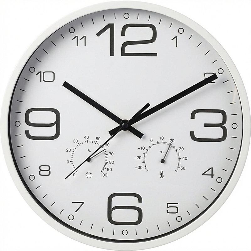 The 30CM WALL CLOCK WITH THERMOMETER, WHITE, is a modern clock with a clear display of time, temperature, and humidity. Its simple, minimalist design is perfect for offices, modern interiors, and even workspaces.