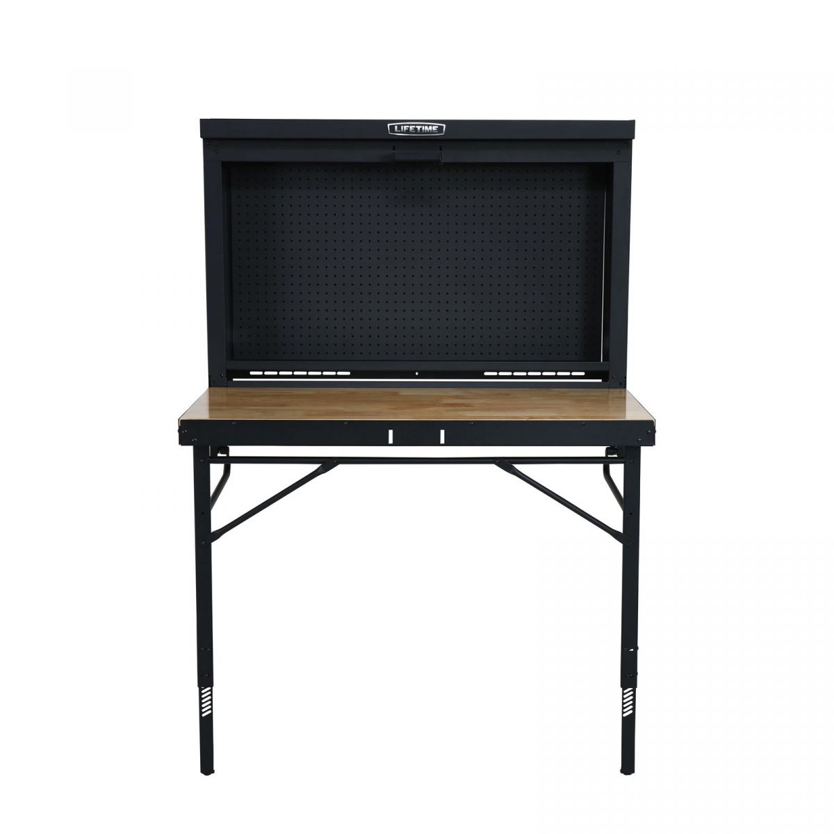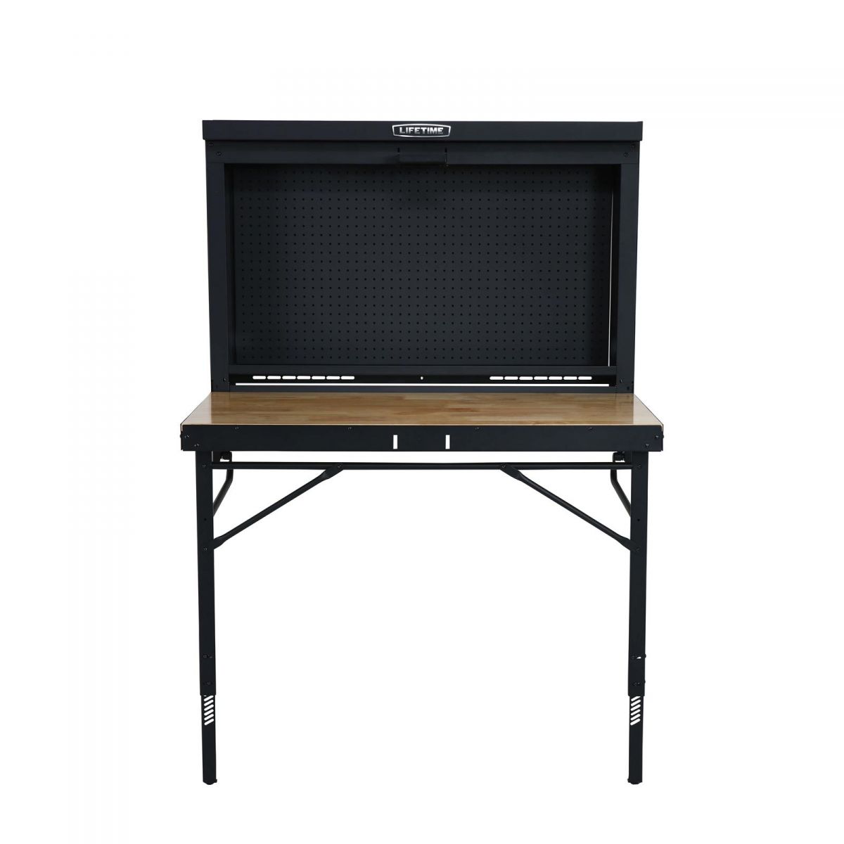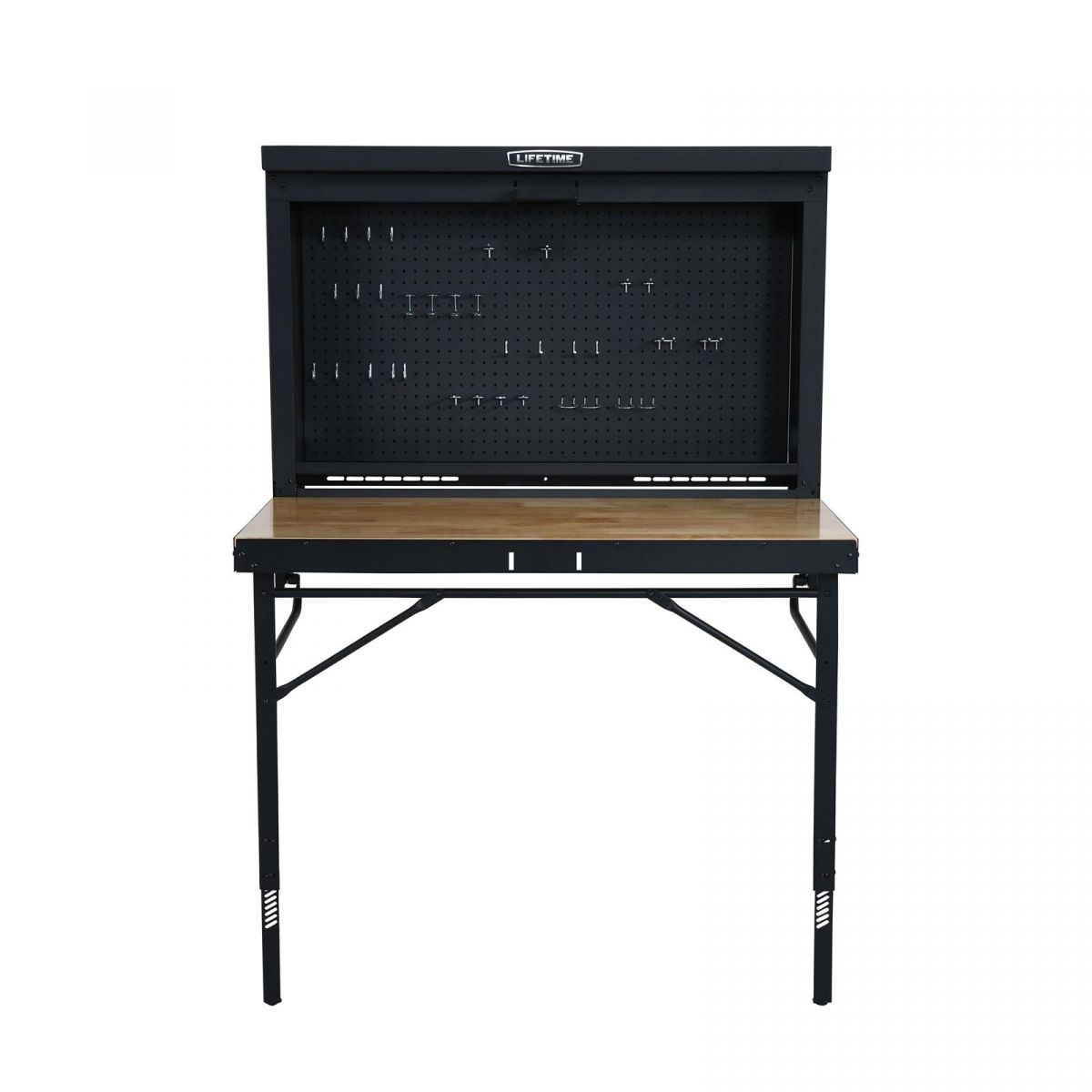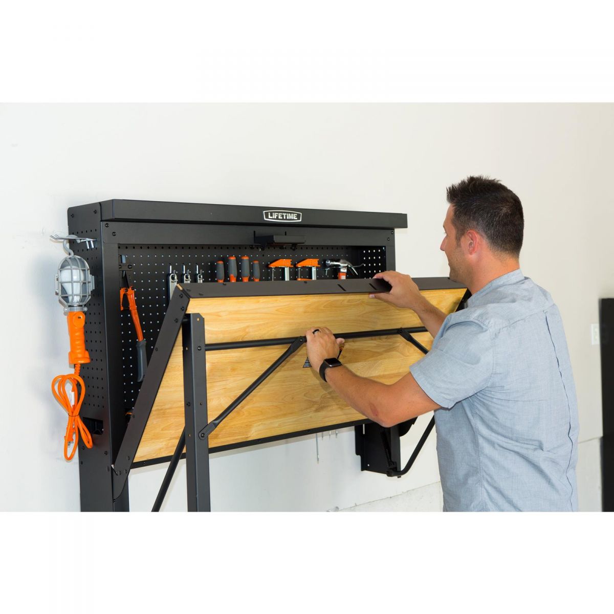 - This wall-mounted workbench is the perfect solution for working and storing tools. It saves space and keeps your workshop or garage organized. It features a tool cabinet with a perforated board for easy organization. Its exceptionally robust construction provides increased resistance to weather and dirt. Adjustable leg lengths allow you to customize your workstation to your individual needs.