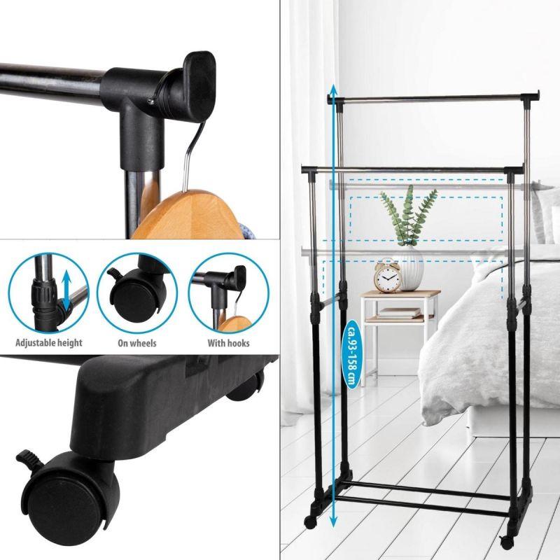 The adjustable height (93–158 cm) allows you to adjust the hanger to fit a variety of garment lengths—from short shirts and sweatshirts to long coats and dresses. This gives you greater flexibility and eliminates the need to worry about wrinkles or limited space underneath.