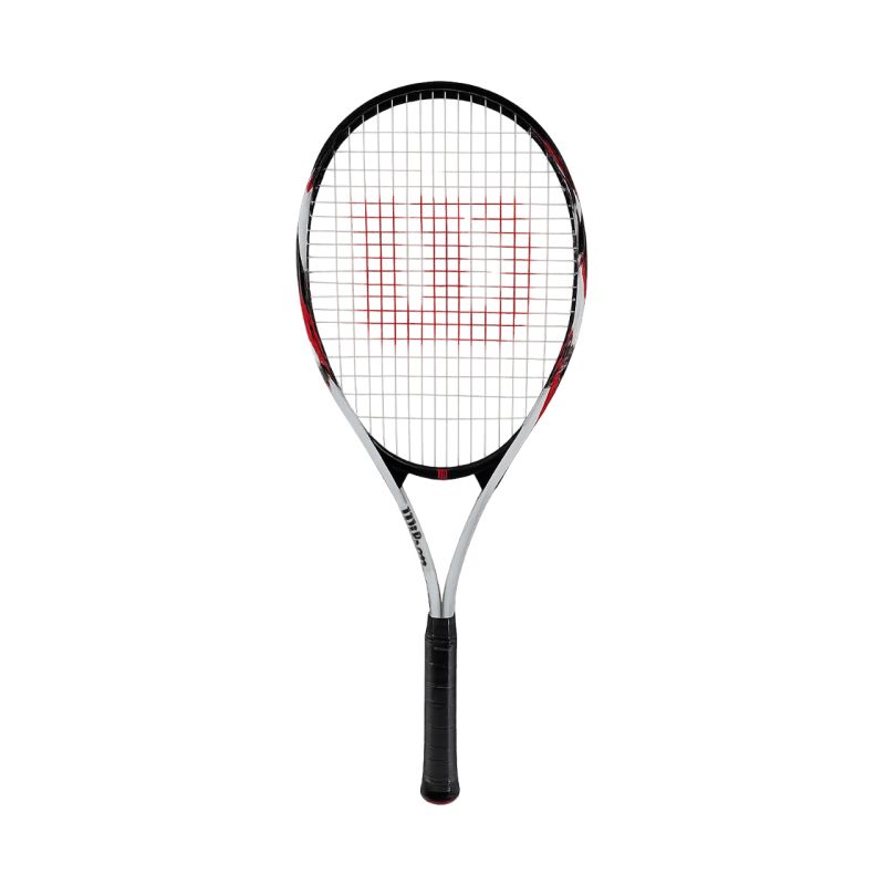 Wilson Fusion XL TNS RKT 3 4 3/8 Tennis Racket, White, Black, and Red, WR199110U3. This Wilson tennis racket is perfect for beginners or occasional players. The extra-large head ensures comfort and proper power. The lightweight design doesn't weigh down the arm. Slightly longer than standard models, the racket provides greater reach. AirLite Alloy technology reduces the racket's weight while maintaining durability. V-Matrix technology additionally reinforces the racket's frame structure and profile to increase power. The Stop Shock Sleeves system reduces racket vibrations during impact. The racket is factory-strung. Technical data: Handle size: L3 (4 3/8) Material: aluminum Weight (unstrung): 274 g Racket length: 69.9 cm / 27.5 in String pattern: 16x19 in Balance (unstrung): 32.0 cm Head area: 723 cm² / 112 in² Grip: factory Factory-strung: yes Cover included: no