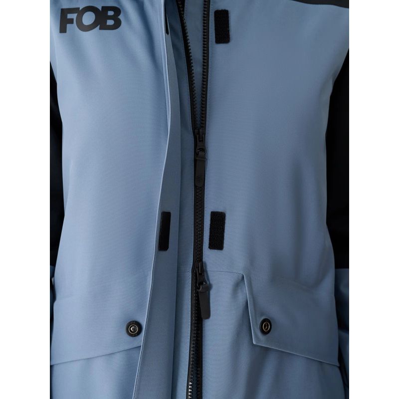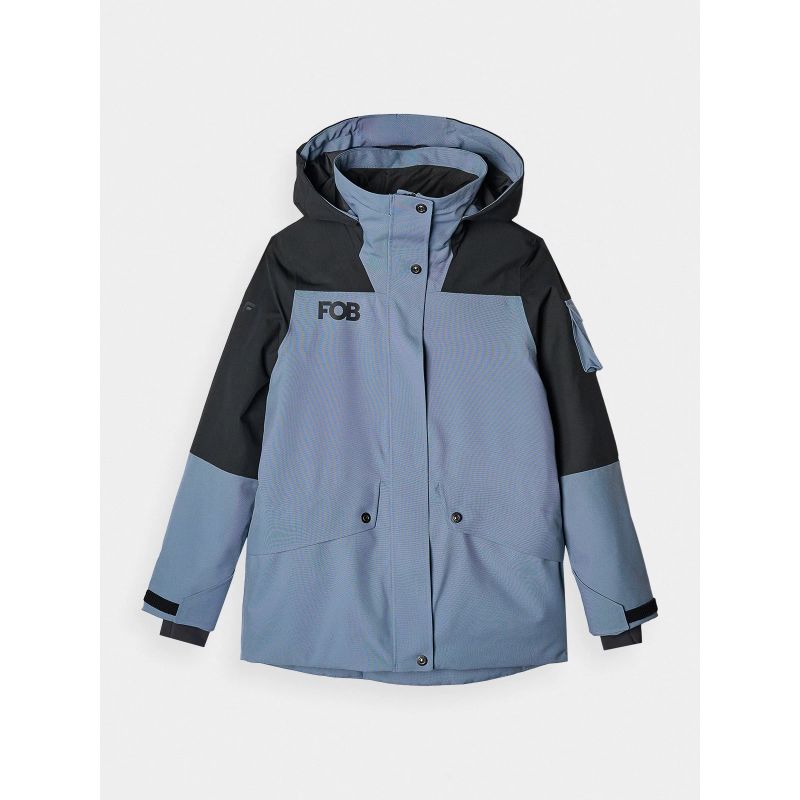 This women's snowboard jacket with a membrane features an integrated hood with a contoured visor and adjustable volume and depth. A high collar lined with soft tricot protects the neck, providing additional protection against cold and wind. The sleeves are finished with Velcro-adjustable cuffs. Extended internal elastic cuffs with thumbholes protect the wrists and hands from chilly winds. Underarm ventilation is secured with a one-way zipper concealed by a placket, allowing you to regulate airflow. Two zippered pockets are located on the sides. Inside, there's an open goggle pocket made of stretchy mesh. Furthermore, an internal zippered pocket allows for the safe transport of valuables, such as a phone. On the left arm, there's a small Velcro-closure pocket and a zippered ski pass pocket, perfect for storing ski passes or other small items.