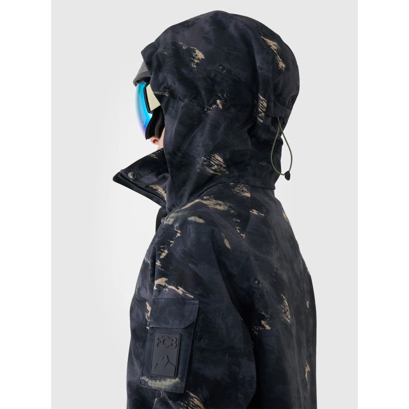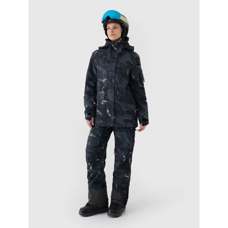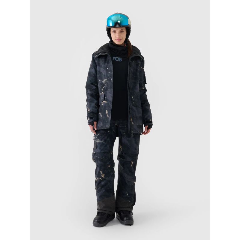 This women's snowboard jacket with a membrane features an integrated hood with a contoured visor and adjustable volume and depth. A high collar lined with soft tricot protects the neck, providing additional protection against cold and wind. The sleeves are finished with Velcro-adjustable cuffs. Extended internal elastic cuffs with thumbholes protect the wrists and hands from chilly winds. Underarm ventilation is secured with a one-way zipper concealed by a placket, allowing you to regulate airflow. Two zippered pockets are located on the sides. Inside, there's an open goggle pocket made of stretchy mesh. Furthermore, an internal zippered pocket allows for the safe transport of valuables, such as a phone. On the left arm, there's a small Velcro-closure pocket and a zippered ski pass pocket, perfect for storing ski passes or other small items.