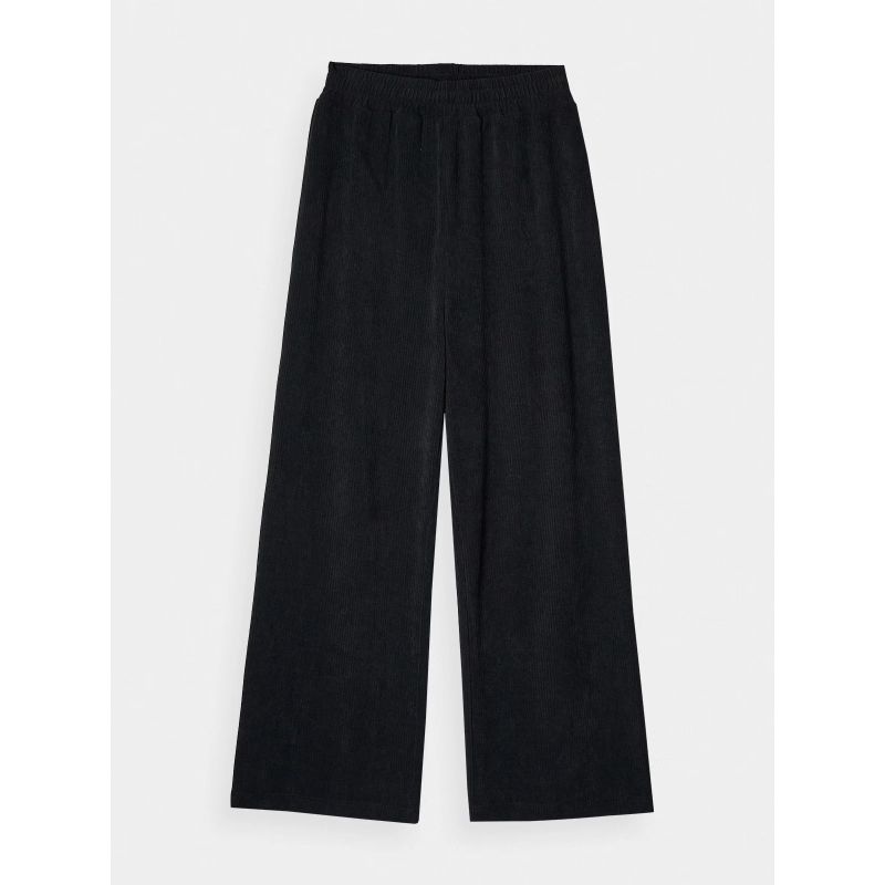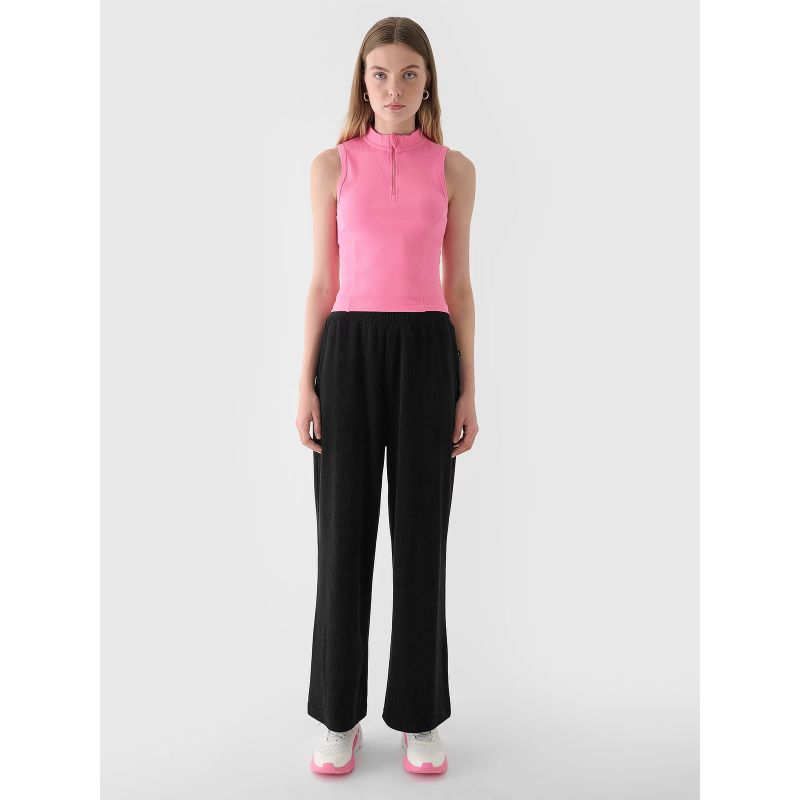 These women's velour sweatpants are made of velour with a subtle sheen. Velour is distinguished by its soft, delicate surface. It also offers high elasticity and flexibility, and drapes beautifully. A 5% polyester content ensures the material maintains its shape and is wear-resistant for many seasons. The pants are unlined, making them lighter and suitable for warmer days. The elastic waistband is non-adjustable.
