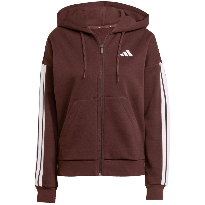 Women's adidas Essentials 3-Stripes Full-Zip Fleece Hoodie Brown JY3082 This women's adidas sweatshirt is the perfect choice for women who value functional everyday wear. It features a soft, cotton-rich fabric for exceptional comfort. Its standard fit offers plenty of mobility. A full-length zipper. The integrated drawstring hood provides wind protection. Open side pockets offer convenient storage for small essentials. Ribbed cuffs and hem. Shoulder straps. Lightweight insulation. Material: 55% cotton, 36% recycled polyester, 9% viscose.