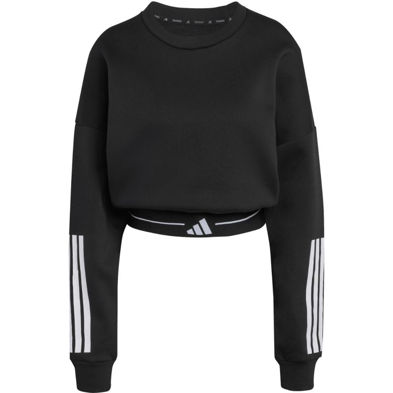 Women's adidas Hyperglam Black Sweatshirt KB3677 This women's adidas sweatshirt is perfect for everyday wear and for a gym session. It features a cropped cut with a rounded neckline. Cotton fabric with synthetic fibers. Elastic cuffs add a stylish finish to the sleeves. A drawstring waistband. Stripes on some of the sleeves and a subtle logo. Material: 70% cotton, 30% recycled polyester