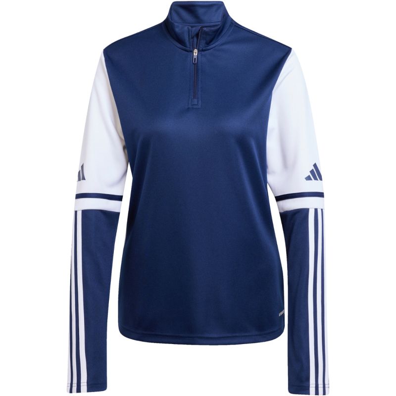 Women's adidas Squadra 25 Training Top Navy Blue JD3017. This adidas women's sweatshirt is perfect for training. It has a standard fit. Quick-drying fabric with Aeroready technology wicks away excess moisture. The mid-chest zipper is finished with a chin guard. It features a stand-up collar and a small logo. Stripes on some of the sleeves. This product is made of high-quality recycled materials. Material: 100% recycled polyester.