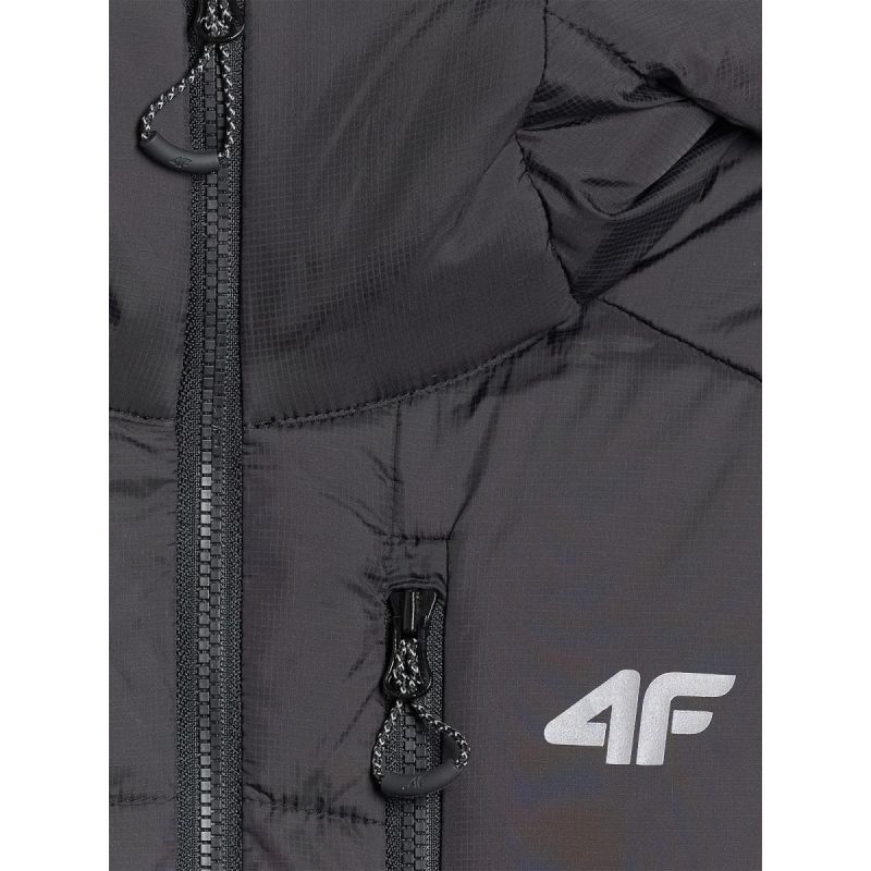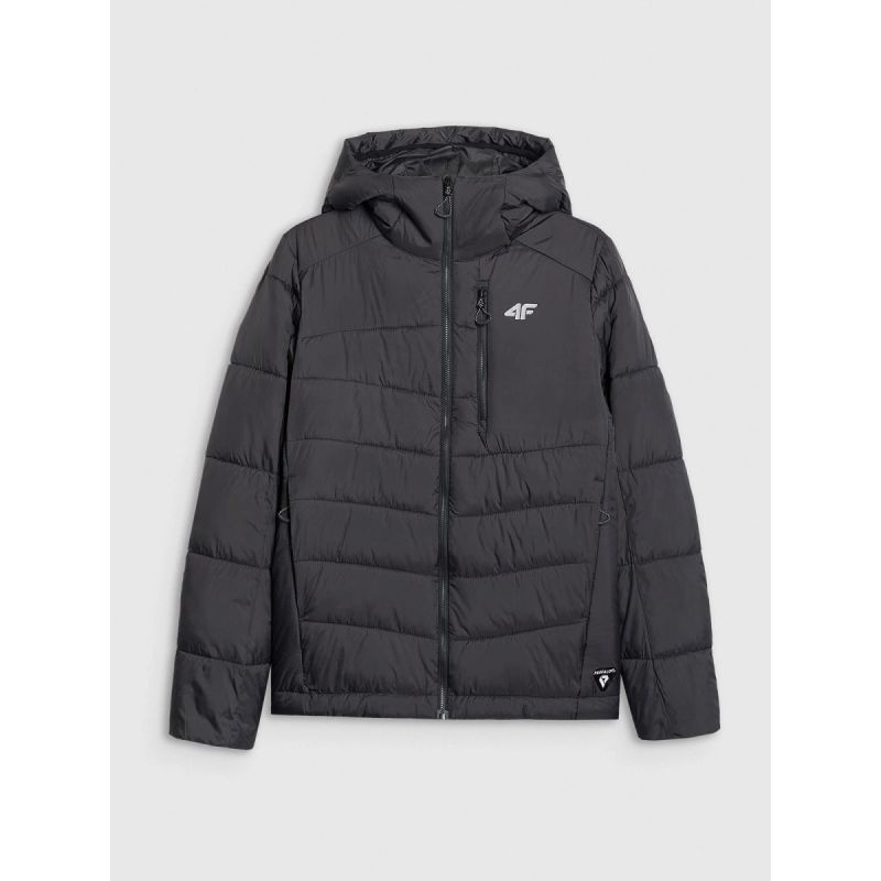 The women's 4F down trekking jacket with Primaloft Silver insulation is an ultralight and functional layer designed for mountain hikes and activities in variable weather conditions. It provides effective thermal insulation even in humid environments, while zoned Primaloft Black insulation enhances protection in areas most susceptible to cold. A hydrophobic coating helps protect against moisture, and the lightweight construction won't weigh you down while hiking. Featuring a regular fit , an integrated hood with an adjustable drawstring, three zip pockets, elastic cuffs, and an adjustable hem with cord stoppers, the jacket offers excellent comfort and a secure fit on the trail. The packability of the jacket increases mobility, while reflective elements enhance safety in challenging lighting conditions. This model is designed to provide warmth, freedom of movement, and reliability on every mile of your mountain trek.