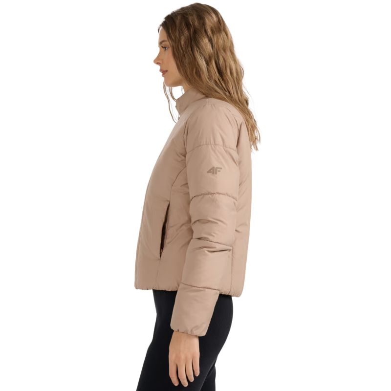4F Women's Jacket F0705 Beige 4FRAW25TDJAF0705 083S This 4F women's jacket is perfect for everyday and sports activities on warmer or cloudy days during the transitional period. It can also be worn as an insulating layer under a jacket with a waterproof membrane. Technical data: Main material: 100% polyester Lining: 100% polyester Filling: 100% polyester Slim cut - adapts to the body, emphasizing the sporty character Hip length - standard cut suitable for everyday use Lightweight transitional jacket - ideal for warmer, cloudy days Hydrophobic coating - limits moisture absorption and protects against light rain Synthetic filling - provides thermal insulation even in humid conditions Rip stop material - increased resistance to tearing and mechanical damage Low stand-up collar - additional neck protection against cold Rubber-trimmed cuffs - better fit and reduced wind penetration 2 side pockets with zippers - safe storage of small items One-way main zipper with a wind flap - protection against heat loss