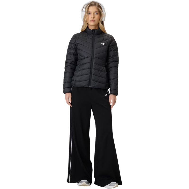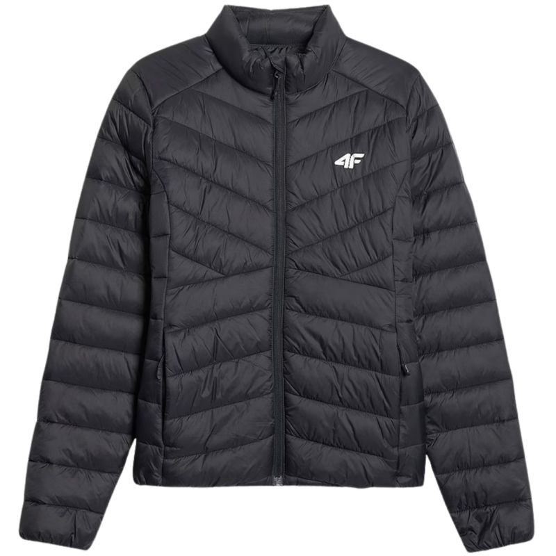 4F Women's Jacket F0855 Deep Black 4FWSS26TDJAF0855 20S A lightweight women's jacket for cold days, featuring synthetic fill that provides warmth and manages moisture. A water-repellent coating reduces moisture absorption in light rain, while the quilted construction promotes even warmth. A stand-up collar protects against wind, and the slim fit ensures comfort. Elastic cuffs and hem help retain warmth, while zip pockets add everyday functionality. Technical data: Main material: 100% polyester Lining: 100% polyester Filling: 100% polyester Synthetic down - provides warmth and lightness, remaining easy to care for even after contact Hydrophobic impregnation - the outer material limits water absorption, supports protection against light rain Quilted construction - evenly distributes insulation and gives the jacket a dynamic, sporty look Stand-up collar - protects against gusts of wind and cold Tailored cut - emphasizes the feminine silhouette, ensuring comfort of wearing 2 zip pockets - safe storage of small items during everyday activities Elastic cuffs and hem - better fit and protection against cold and wind