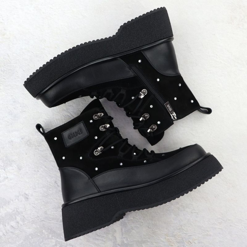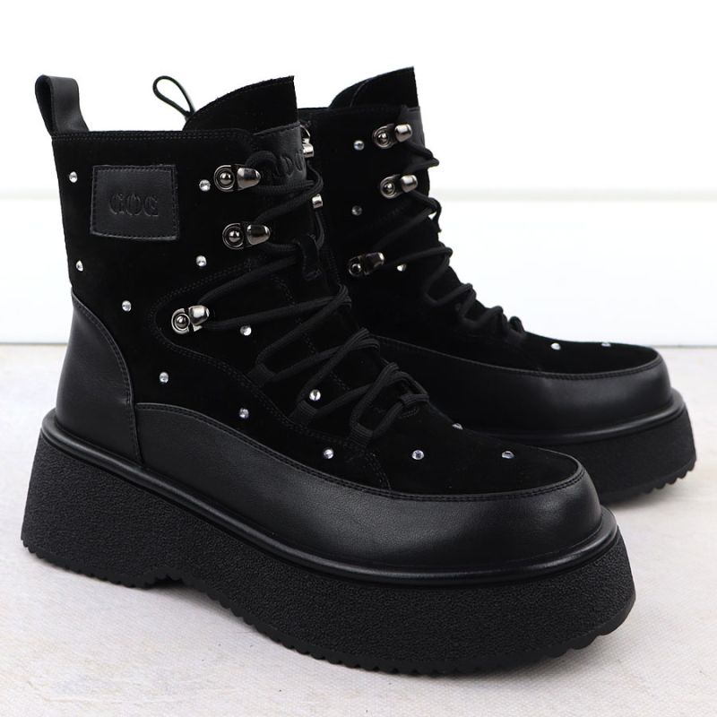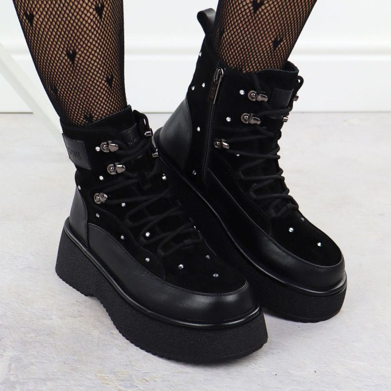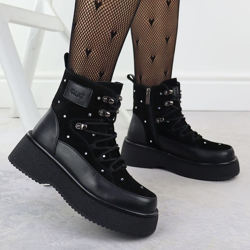 Women's leather ankle boots with rhinestones on the platform, black Goe SS2N4140