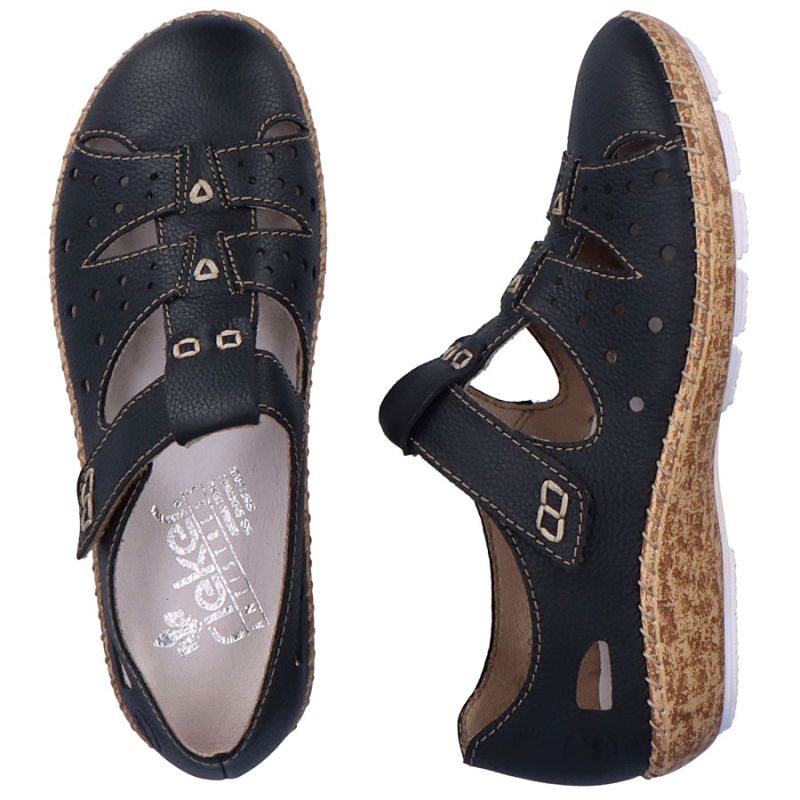 Women's leather openwork shoes, comfortable, with Velcro, black, Rieker 44852-14