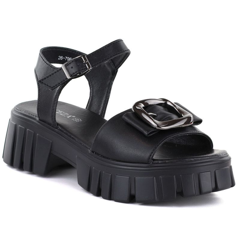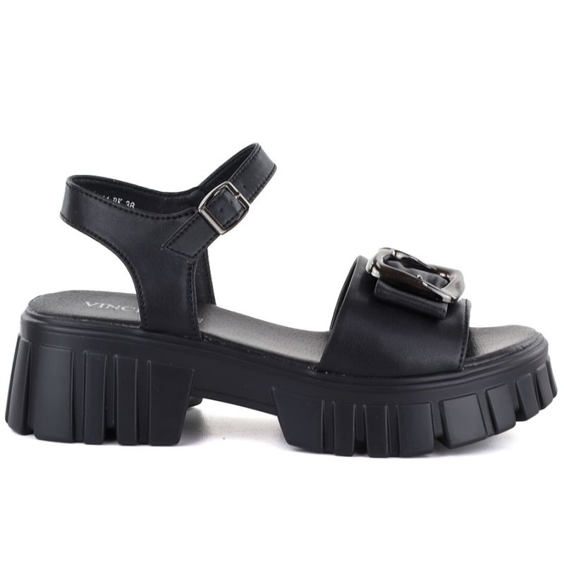 Women's leather sandals on a platform with decoration, black Vinceza 26-79611