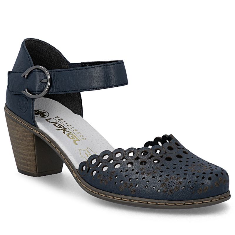 5. Women's leather sandals with a comfortable heel, openwork, navy blue, Rieker 40902-14