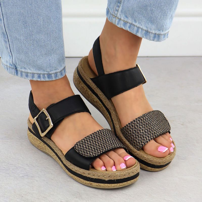 Women's leather wedge sandals with Velcro straps, black Rieker V0951