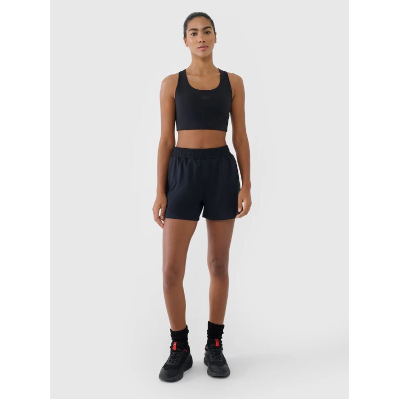 4F women's training shorts provide reliable support and comfort at every stage of your workout . Thanks to quick-drying, stretchy materials and a comfortable fit , the shorts allow for complete freedom of movement and maximum focus during exercise . They feature a regular fit that comfortably hugs your figure, a high waist, and short legs for enhanced coverage and comfort.