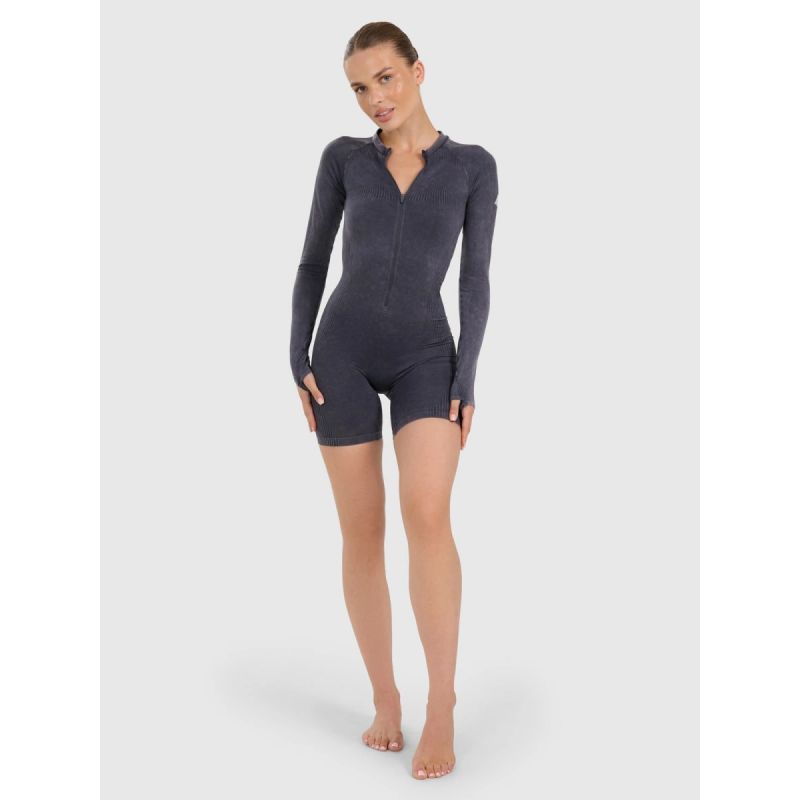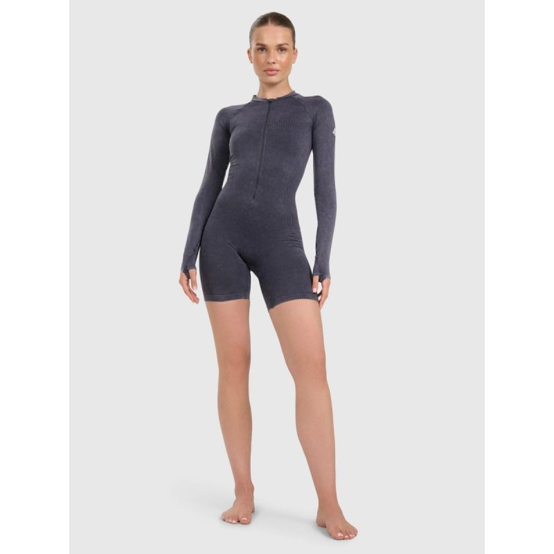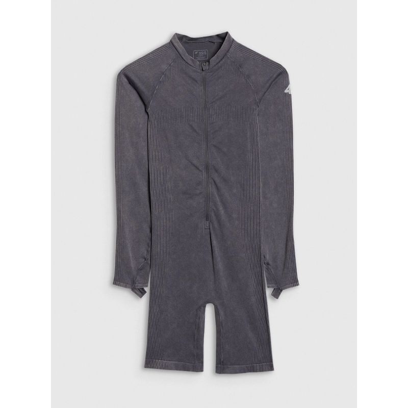 This women's 4F yoga jumpsuit is designed for a smooth, conscious practice and complete comfort. The seamless construction minimizes the risk of chafing, while 4FDry technology promotes rapid moisture wicking, helping you stay dry even during more intense sessions. The slim fit conforms to your body shape, flattering your figure and providing comfort in every pose. Raglan sleeves enhance arm mobility, while short legs allow for full range of motion. A zipper closure makes it easy to put on and allows for adjustable breathability. The soft, stretchy fabric with elastane drapes comfortably, is non-sheer, and is easy to care for. This minimalist yet functional style is perfect for both the mat and everyday activities.