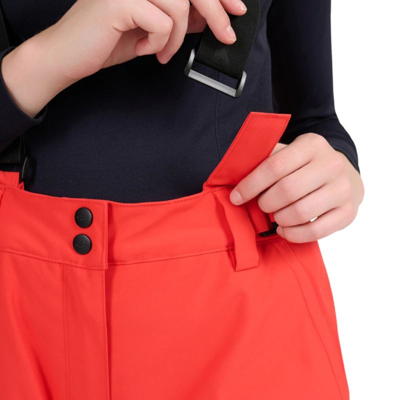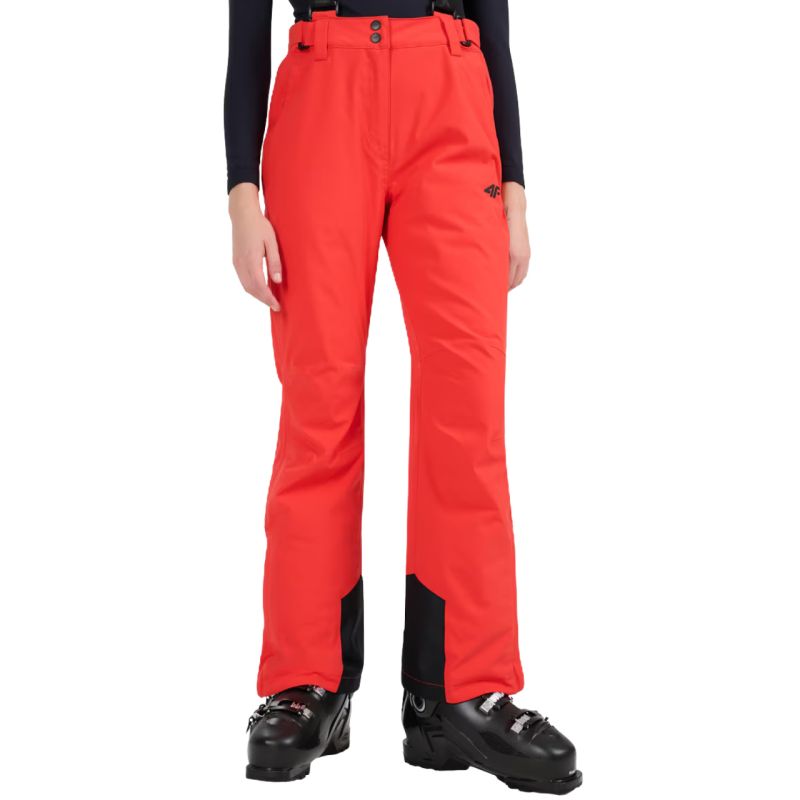 Women's ski pants 4F FNK F0944 red 4FWAW25TFTRF0944 62S Women's ski pants 4F will provide freedom and protection not only on the slopes. Technical data: Main material: 100% polyester Additional material: 100% polyester Lining: 100% polyester Filling: 100% polyester (polyester insulation) Membrane waterproofness level: 5,000 mm Membrane breathability level: 3,000 g NeoDry 5000/3000 membrane - protects against light rain and supports the breathability of the material All seams taped - additional protection against moisture penetration Hydrophobic finish - limits water absorption by the outer layer of the material Polyester insulation - provides warmth without additional weight Inner snow gaiters - prevents snow from getting inside Detachable, adjustable suspenders - allow for individual adjustment and comfort of wearing Velcro adjustable waist - easily adapts to the figure and ensures stability Reinforcements at the bottom of the legs - increase the durability of the material in key areas· Zippers on the sides of the legs - make it easier to put the pants on over ski boots· 2 side pockets with zippers - for small items you want to always have at hand· Profiled knee zone - better mobility while skiing· High waist - protects the back and increases thermal comfort on the slope· Smooth lining - easily moves over thermal clothing· Reflective elements - improve visibility in low light· Regular fit - guarantees comfort and freedom of movement· Ankle length - full leg coverage, ideal for winter conditions