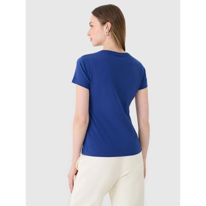 This women's 4F T-shirt is perfect for casual and sporty styles. The slim fit hugs the figure, accentuating its silhouette, while the standard length ensures all-day comfort. The smooth single jersey fabric provides softness, elasticity, and comfort, while its 180 gsm weight ensures a good drape, is non-sheer, and is suitable for year-round wear. Made from 95% cotton and 5% elastane , the T-shirt is soft to the touch, durable, and slightly stretchy. The ribbed crew neckline provides a stylish finish, while the "4F" print on the front adds a modern, sporty touch.